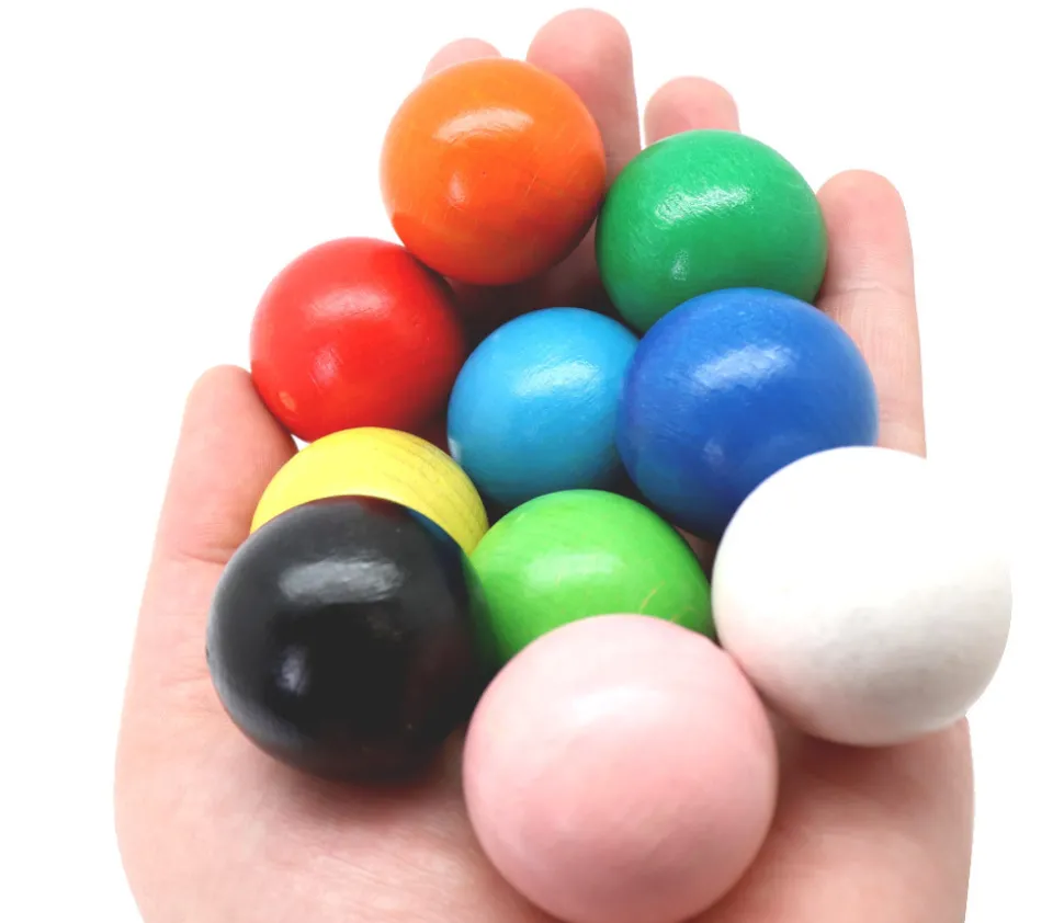Set de 10 boules colorées non percées en bois pour jeux. Boules rondes de 3 cm de diamètre.
