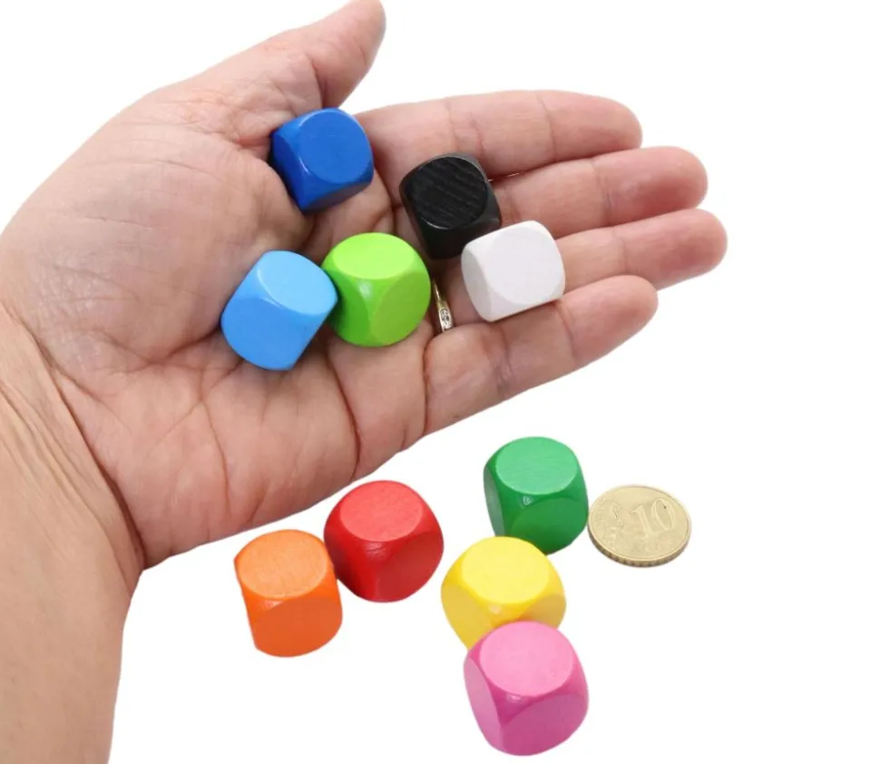 Dé en hêtre teinté, vendu en lot de 10 couleurs : blanc, rouge, rose, vert, vert-clair, bleu, bleu-clair, orange, noir, jaune