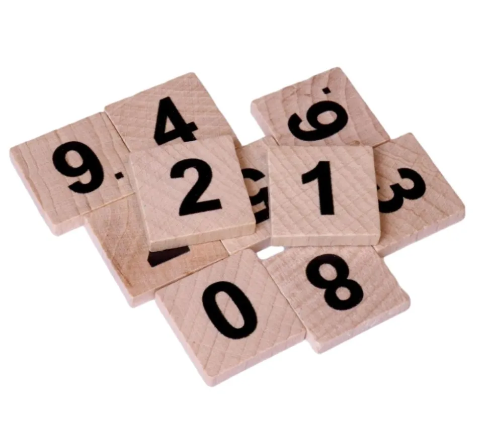 Petites tuiles en bois de forme carré avec une face neutre et l’autre face avec un nombre de 0 à 9, pour jeux de math ou jeux de société. Lot de 10.