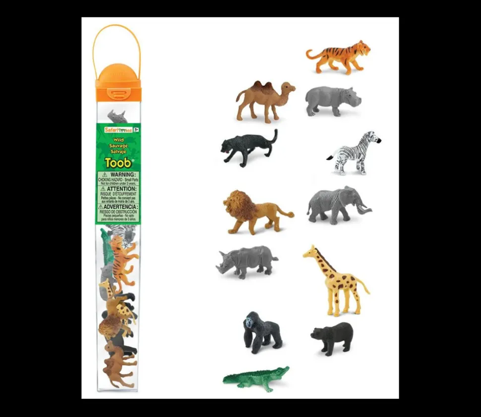 Tube de figurines animaux Sauvages en plastique pour enfants et jeux comprenant : 1 éléphant, 1 zèbre, 1 tigre, 1 hippopotame, 1 crocodile, 1 gorille, 1 rhinocéros, 1 ours brun, 1 girafe, 1 jaguar, 1 chameau, 1 lion.