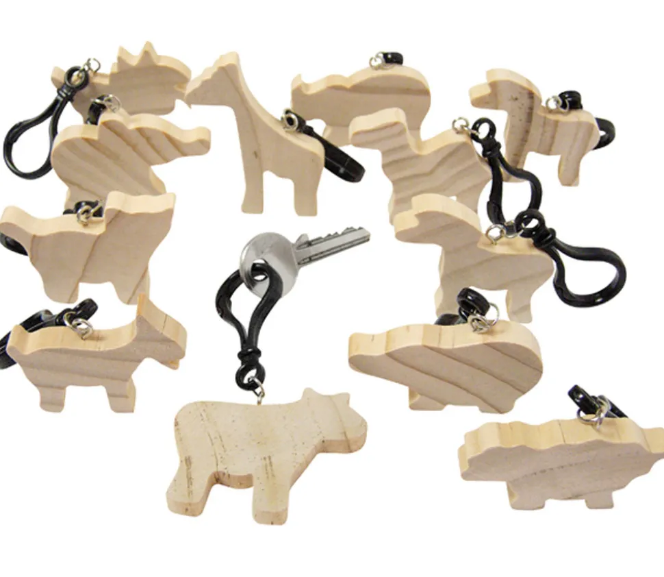 Jolis porte-clés avec mousqueton et figurine animal en bois naturel.