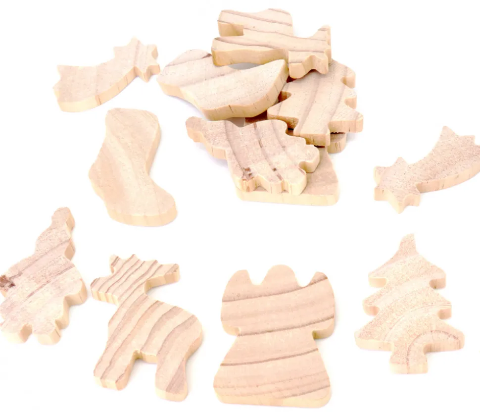Sujets en bois à peindre étoile, Père-Noël, sapin, renne, chaussette et ange pour décorations de Noël.