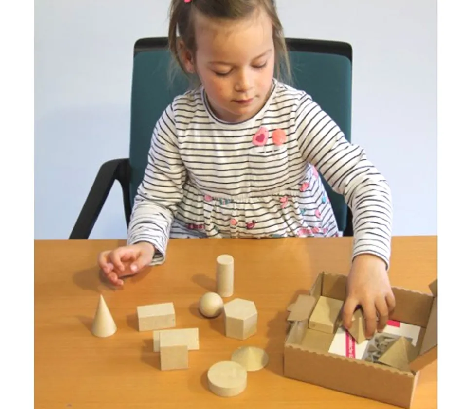 Mise en place facile de jeux et exercices : vocabulaire géométrique (coin, arête, plat…), jeu tactile (retrouver une forme), association d’une image de la forme avec le solide, décrire les formes…