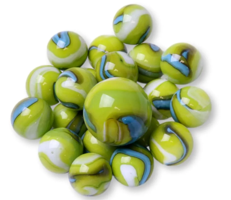 20 billes BOA verte en verre pour jeux de billes récréation pour enfant. Billes taille standard de 16 mm. Lot de 20 billes opaques vertes avec à l’intérieur bandes de peintures colorées+ 1 calot de 25 mm assorti. Billes pas chères pour remplacer vos billes manquantes dans vos jeux de piste, toboggans à boules, labyrinthe ou jeux de société divers.