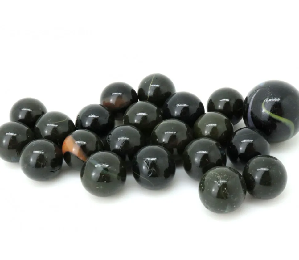 Boules en verre noir opaque avec un liseret coloré. 20 billes de 16 mm + 1 calot d’environ 25 mm assorties livrées dans un filet.