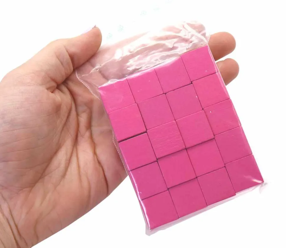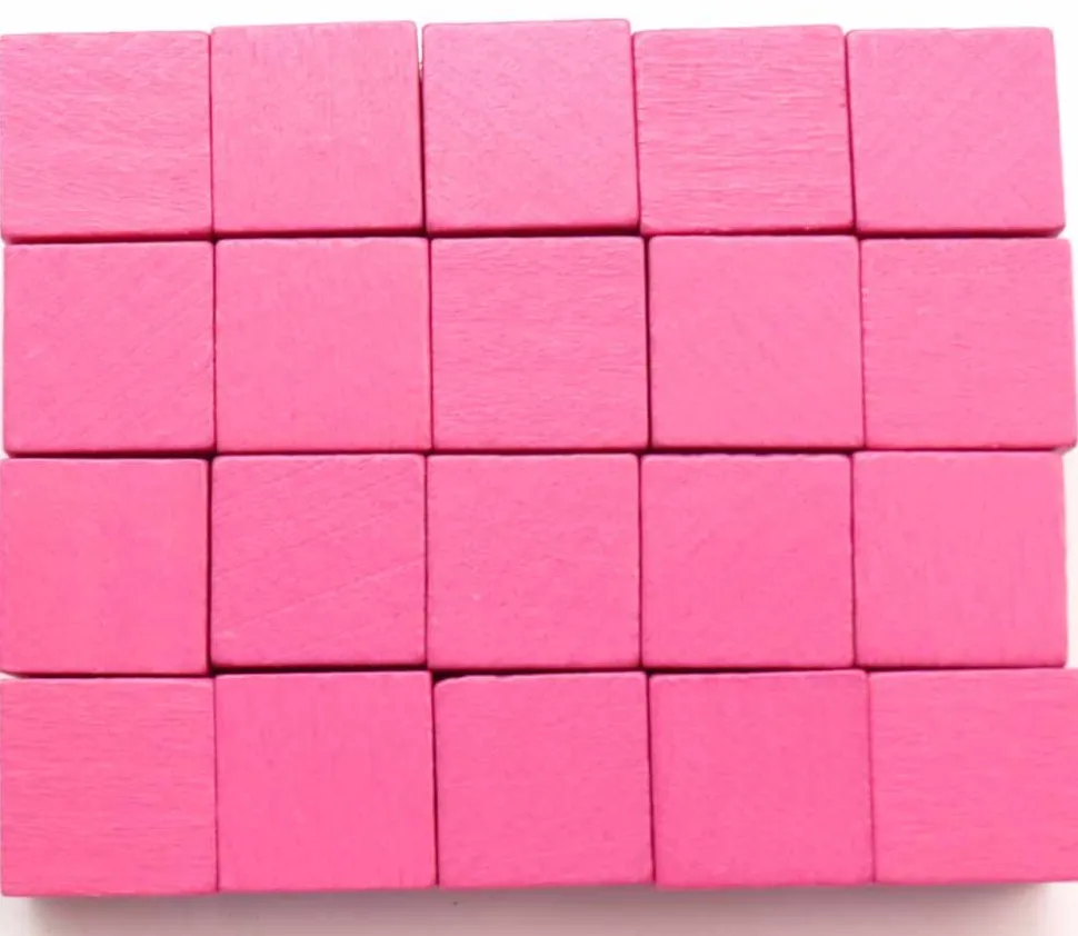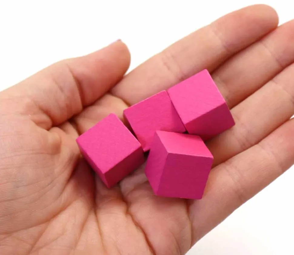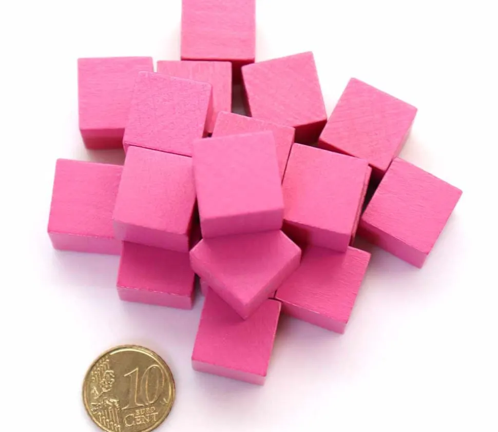 20 cubes en bois de 1.6 cm de côté de couleur rose. Petits cubes pour jeux. Cubes en hêtre ou charme teinté pour vos jeux de société, jeux de construction, activités mathématiques.