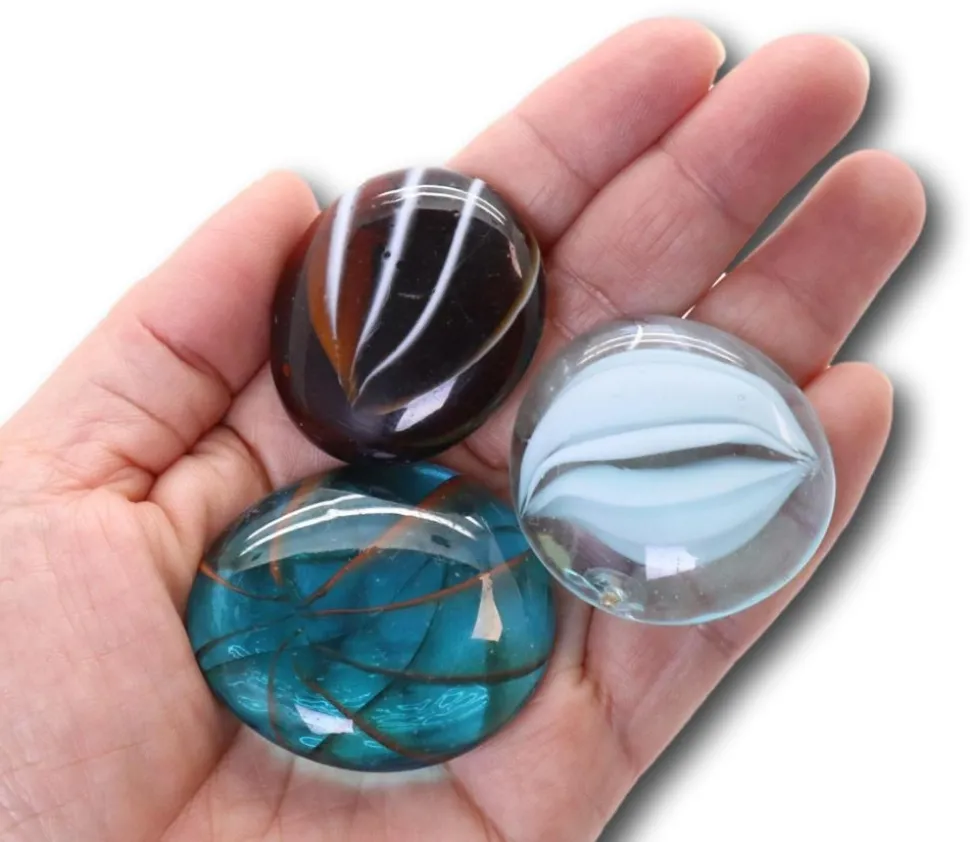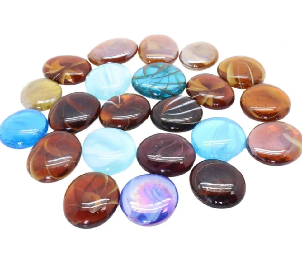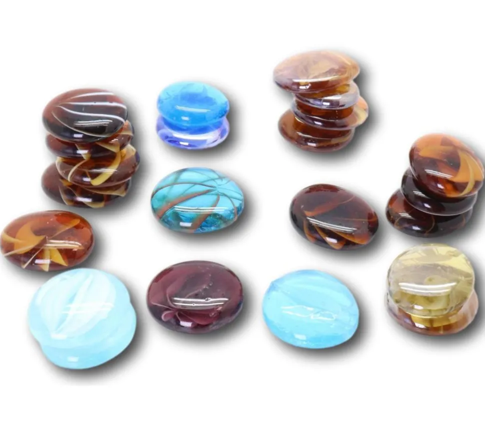 Lot d’une vingtaine de galets arrondis plats en verre de différents couleurs parmi marron, turquoise, bleu, blanc translucide…