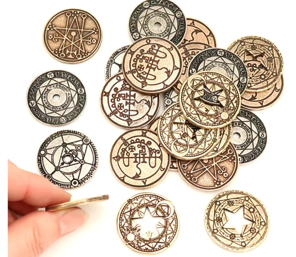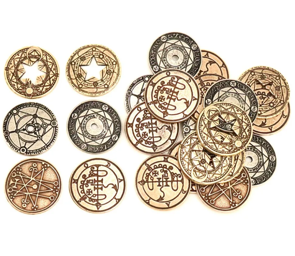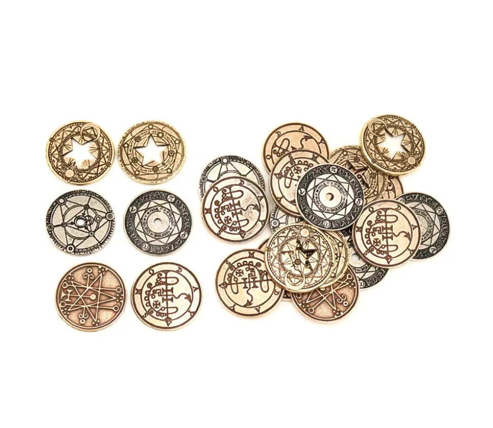 4 pièces en métal : 4 pièces dorées trou étoile, 6 argentées et 10 bronzes. Pièces de jeu mystiques et mystérieuses, super sympa pour créer l’ambiance.