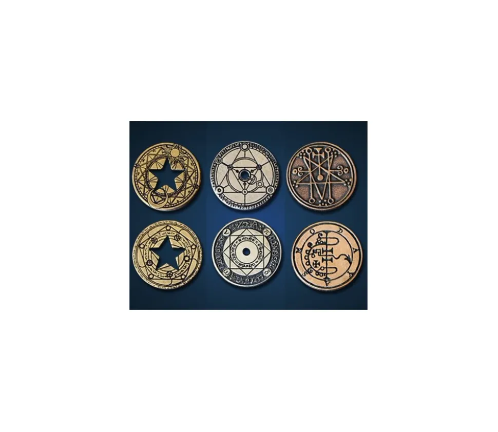 3 Pièces différentes sur le thème de la magie et des magiciens. Belles pièces énigmatiques en métal dont 2 trouées pour vos jeux de société. 2