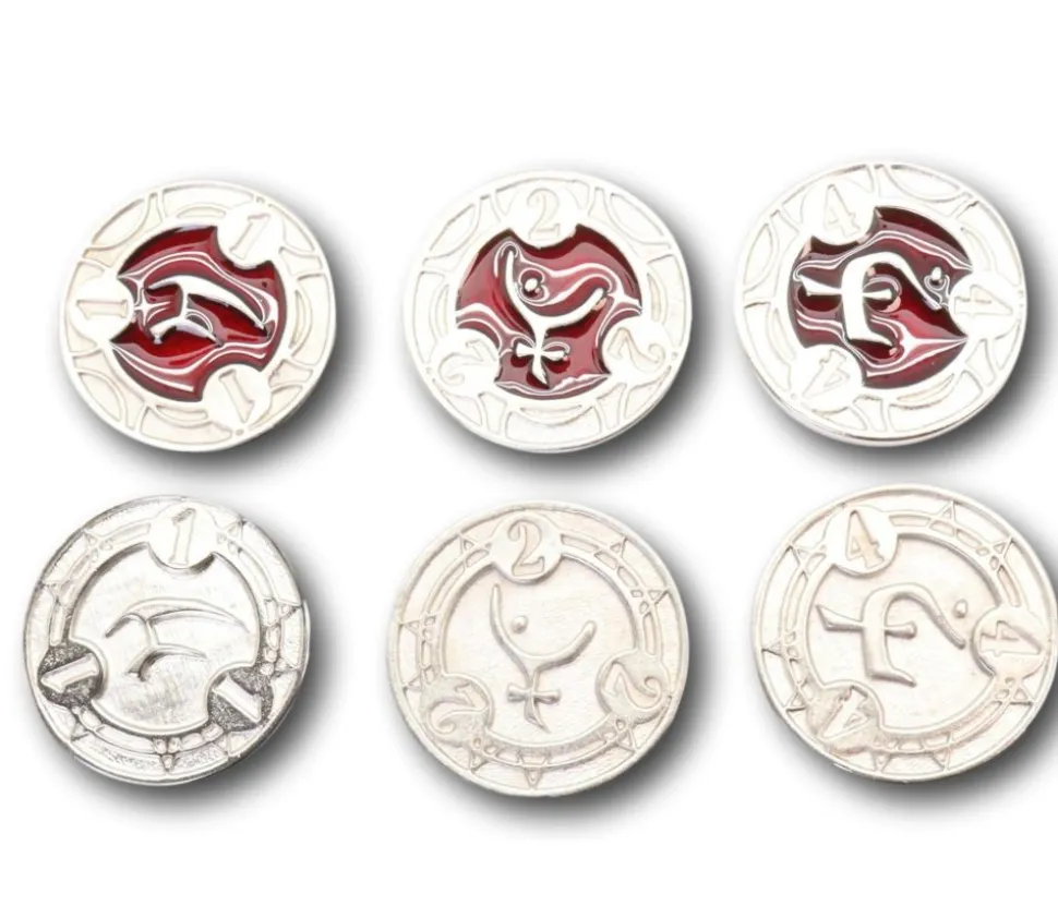 Des pièces magiques mixant le métal gravé et de l’émail rouge. 22 Pièces en métal pour jeu de 27 mm de diamètre et 3 mm d’épaisseur. Ce set contient 22 pièces métalliques dont 9 différentes. Ce superbe set vous permettra de suivre de la plus élégante des manières vos sortilèges dans les jeux RPG les plus populaires. Gravures différentes des deux côtés : une face gravée avec intégration de rouge et une face gravage seulement. Utiliser la face colorée pour le côté actif du sort et le dos de coin pour garder une trace des sorts déjà utilisés. Cela vous permet un super suivi de vos sorts dans vos jeux de rôle. Legendary metal coins Spell RPG tokens. Un mélange vraiment unique.