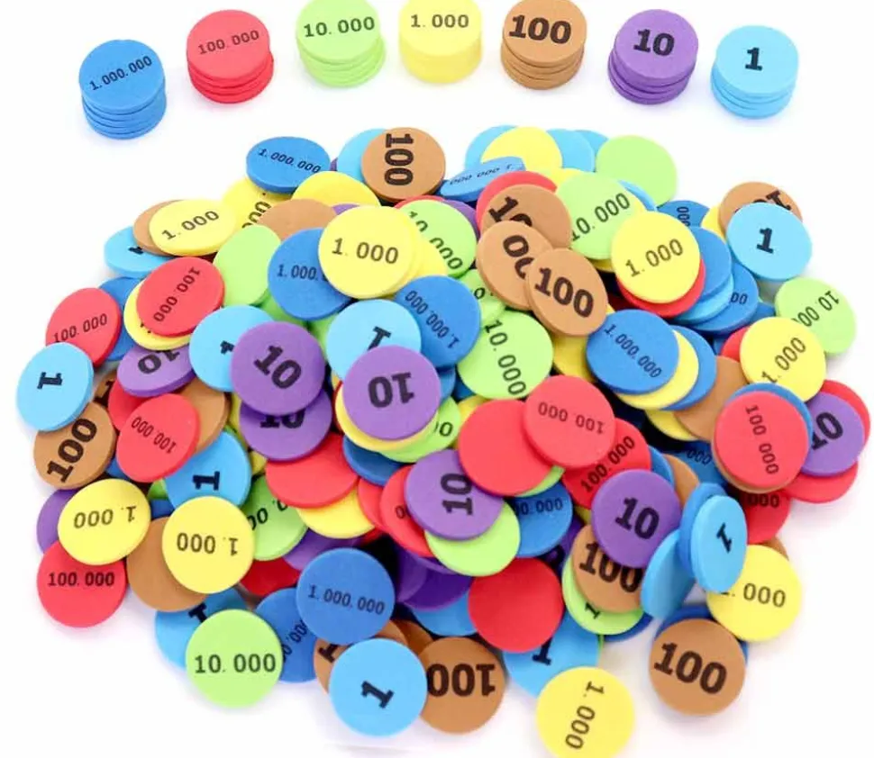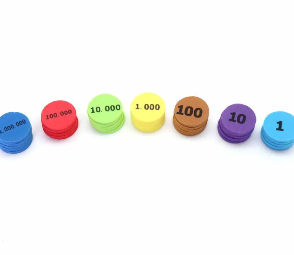 280 jetons valeurs 1 à 1 million. Jetons ronds avec nombres sur un côté. Pion en mousse coloré de 2.5 cm de diamètre. Très pratique pour faire des jeux avec les chiffres et décomposition des nombres. Une couleur est associée à chaque valeur (7 sortes différentes). Impression recto seul (verso neutre). couleurs jetons aléatoires.