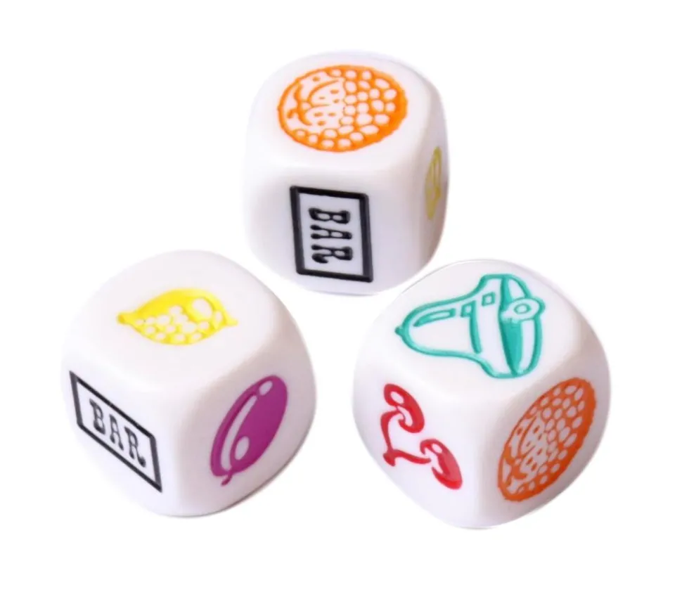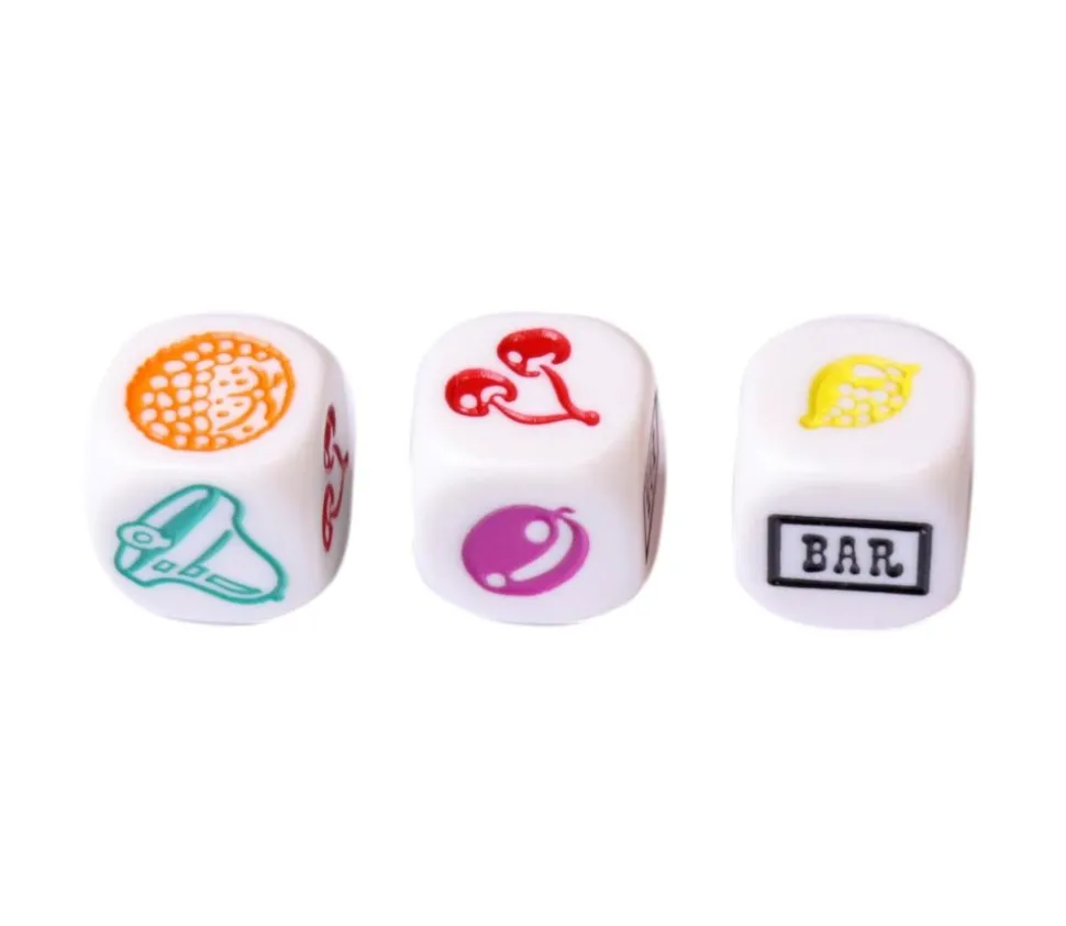 Lot de 3 Dés à jouer originaux avec fruits symboles différents colorés comme sur les machines à sou du casino. Dé spécial à 6 faces avec une face avec un citron jaune, une face avec une orange de couleur orange, une face prune couleur prune violet, une face cerise rouge, une face clochette verte et une face avec BAR écrit en noir.