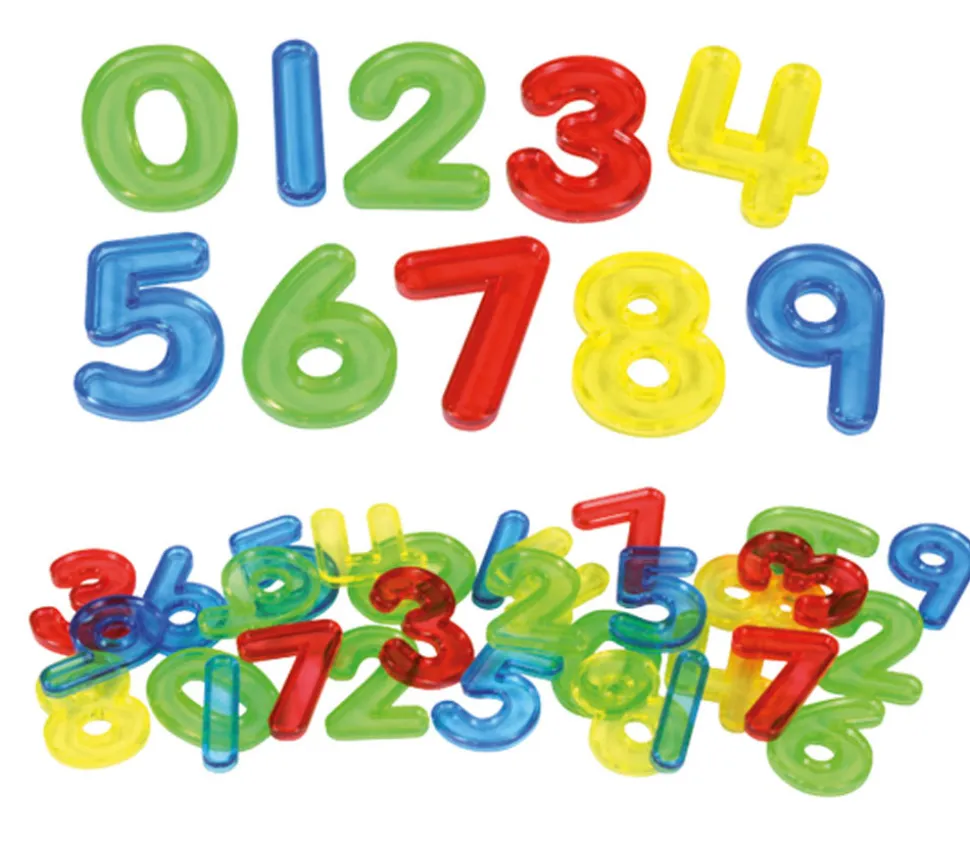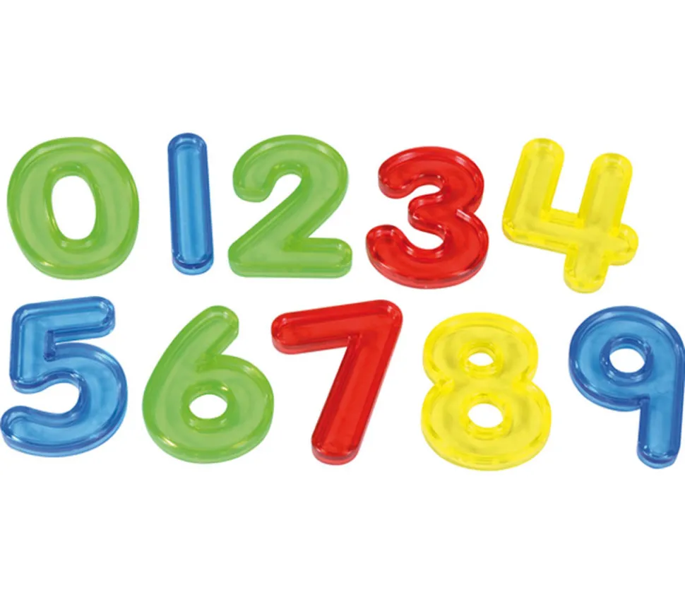 Chiffres en plastique coloré translucide : 30 chiffres de 0 à 9 pour composer les nombres. Chaque chiffre est disponible en 3 exemplaires.
