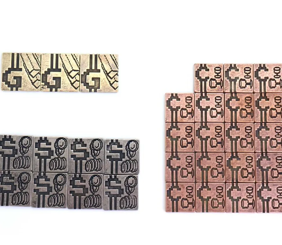 3 Pièces différentes de forme carrée avec des gravures des 2 côtés. Très belles pièces historiques pour vos jeux de société. Finition vieillie usée. 3 pièces couleur or gravure princesse au recto lingot d’or au verso, 8 pièces couleur argent avec chevalier au recto pièces d’argent au verso, 19 pièces bronze dragon sur le recto et graal – calice au verso.