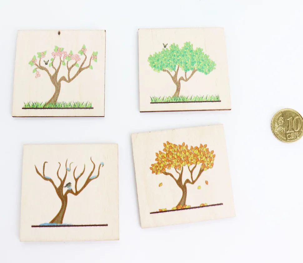 Tuiles de 5 x 5 cm sur du bois naturel contreplaqué avec une impression représentant les 4 saisons de l’année. Grands jetons de forme carré avec des arbres en fonction de la saison : printemps, été, automne, hiver.