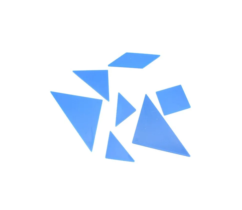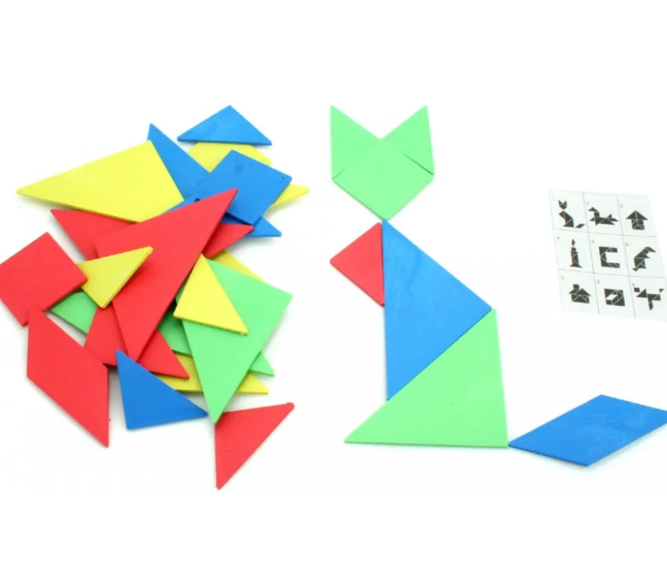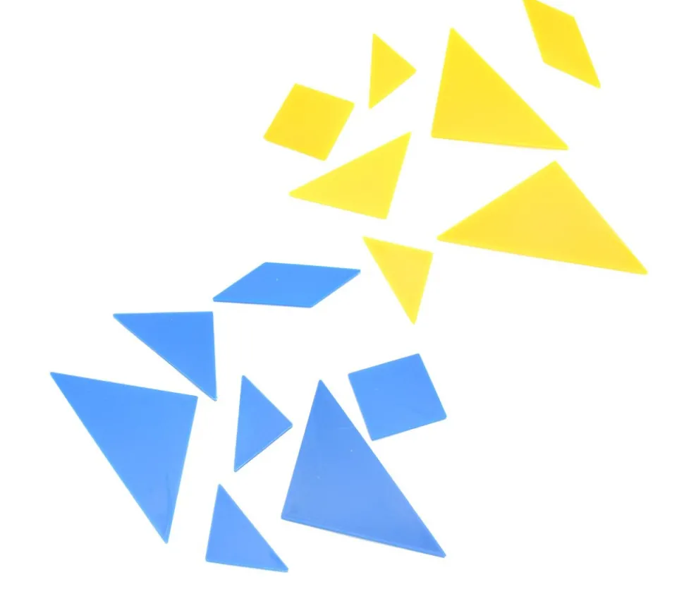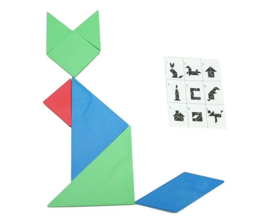 Chaque set comprend 1 tangram rouge, 1 vert, 1 jaune et 1 bleu, parfaits pour explorer la géométrie de manière ludique.