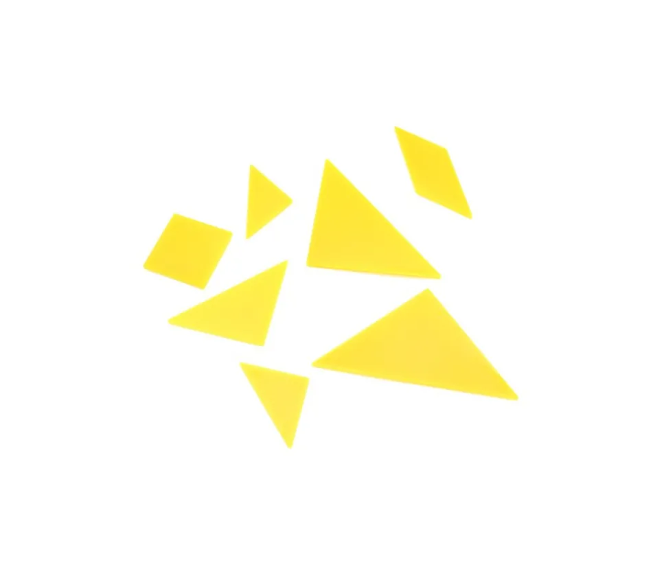 - 7 pièces en plastique jaune (2 grands triangle 9.8 x 7 x 7 cm, 1 carré de 3.5 cm, 2 petits triangles de 4.8 x 3.5 x 3.5 cm, 1 triangle moyen de 7 x 5 x 5 cm et 1 losange de 5 x 3.5 cm)