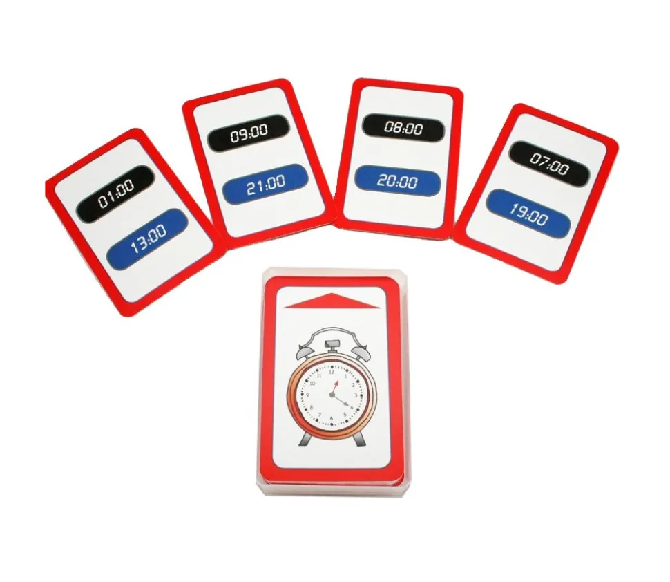 Cartes à jouer apprentissage lecture Heure et minutes. Cartes d’entraînement conversion des heures. Recto horloge avec aiguilles – Verso l’heure indiquée. Cartes de qualité faciles à manipuler de 9 x 6 cm. Boite plastique pour faciliter le rangement avec 48 cartes à jouer. Compatible avec le chapeau magique pour que l’enfant voit la réponse apparaître et rendre le jeu plus fun.