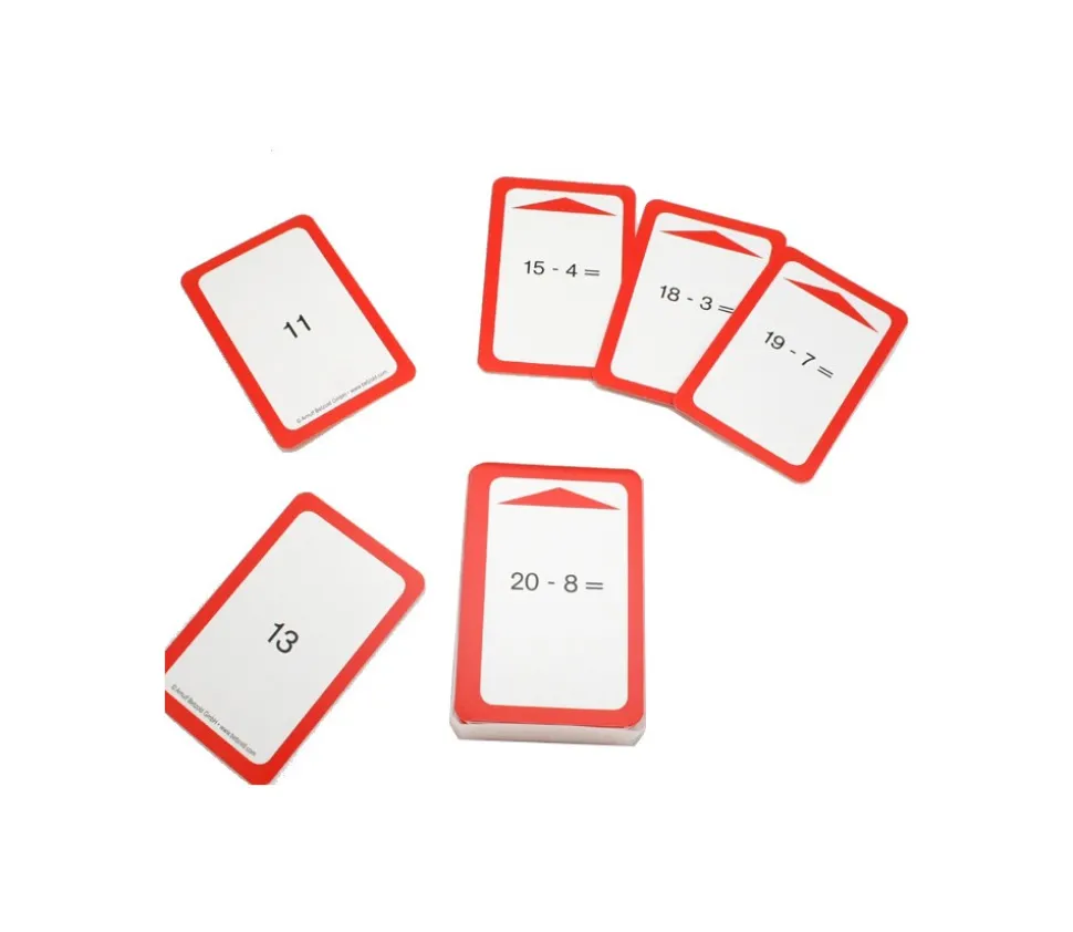 Cartes à jouer soustraction pour l’apprentissage de calcul. Au recto l’opération de soustraction et au verso le résultat. 48 cartes opérations mathématiques de 9 x 6 cm livrées dans une boite plastique pour les ranger facilement.