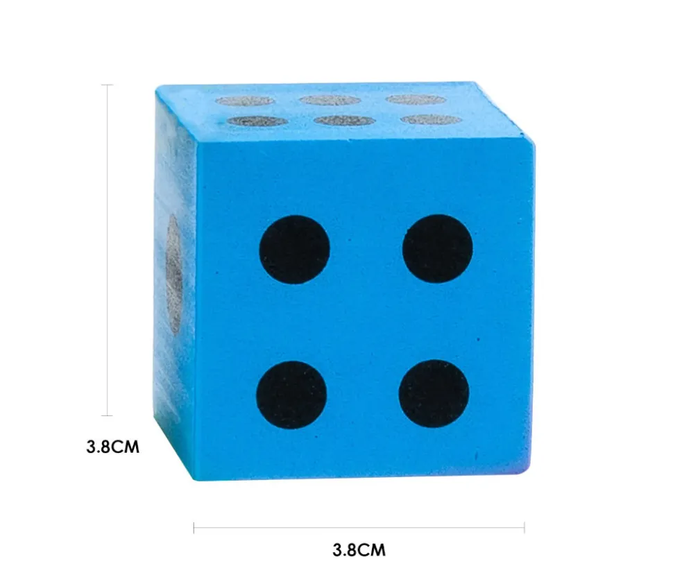 Grands dés 3,8 cm silencieux en mousse colorée avec points de 1 à 6 noirs. Points très lisibles.