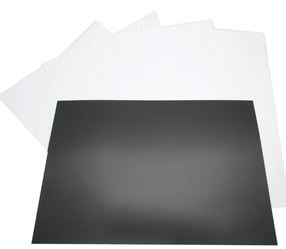 Set de 5 Feuilles aimantées A4 blanche que vous pouvez passer dans une imprimante (la plupart des jets d’encre) et aimanter facilement sur votre tableau par la suite. Créer vos propres supports d’aide à la classe avec ce papier sur lequel vous pouvez imprimer ou écrire et découper pour obtenir des jetons, fiches ou cartes magnétiques personnalisées. 5 feuilles de 297 x 210 mm. Epaisseur de 0.3 mm.