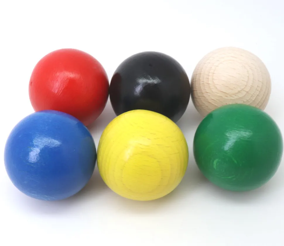 Billes pleines en bois teinté qui peuvent servir de boule de remplacement pour jouer à de nombreux jeux d’adresse, coordination ou motricité.