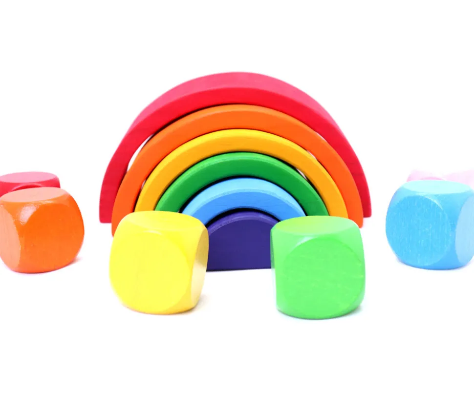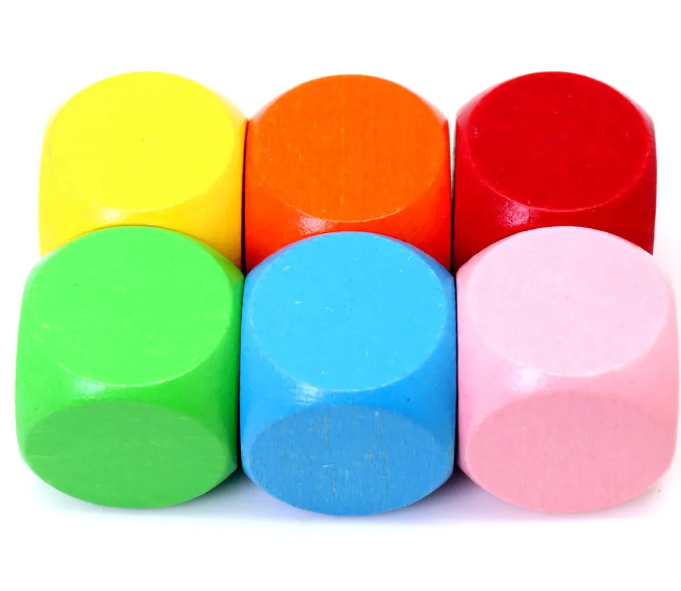 Dés en bois de 6 couleurs différentes : bleu clair, vert clair, jaune, rouge, rose, orange.