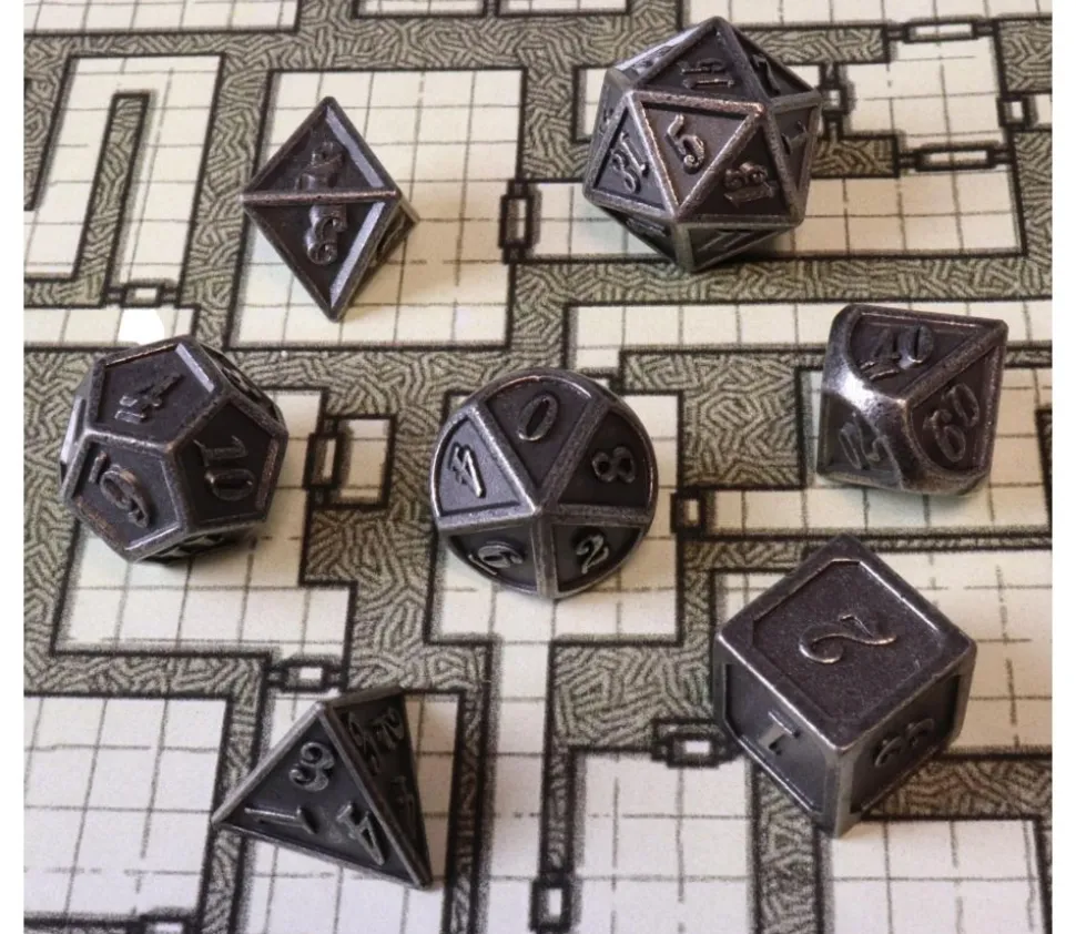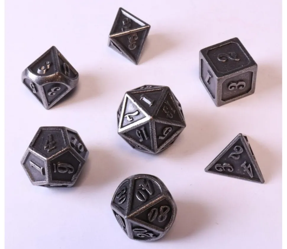 Set de dés à jouer en métal de belle finition pour vos jeux de dés et jeux de rôle RPG. Dés sur du métal couleur argenté foncé avec un gravage en relief des chiffres sur les faces.