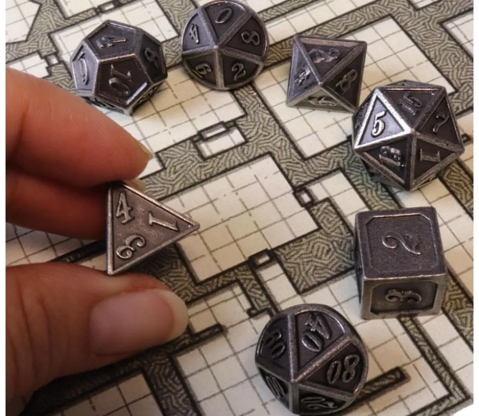 7 Dés à jouer en métal argenté multifaces. Taille du dé 6 faces de 14 mm et dé 4 faces plus petits que d’habitude.