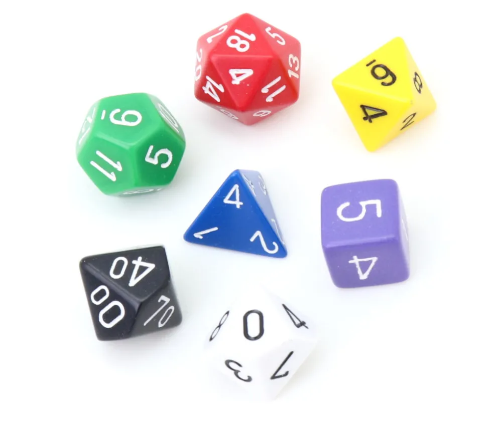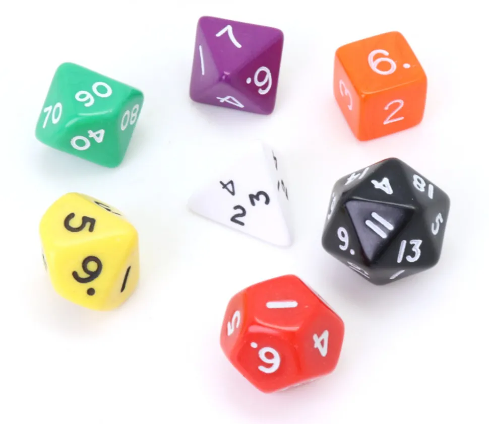 Dés à jouer en plastique opaque de couleurs différentes et variées. Chaque dé a un nombre de faces différent et une couleur différente.