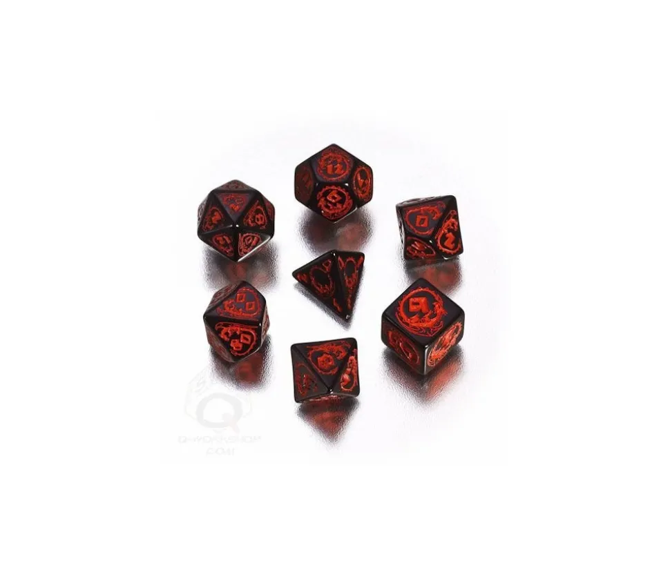 Set de 7 dés à jouer Dragon multifaces rouge et noir. Dés à jouer gravé avec des dragons sur les faces. Fond noir et gravé en rouge.
