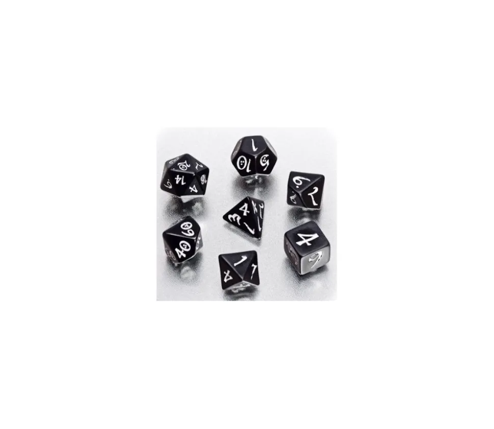 Set 7 dés à jouer noirs multifaces classique effet gravure Elvish. Dés à jouer noirs elven gravés avec des chiffres blancs dans un style elfique. Super effet, trop beau pour vos jeux. 7 dés multi-faces noirs avec gravage blanc des chiffres stylisés pour jeux de rôle ou jeux de société. Gamme RPG.