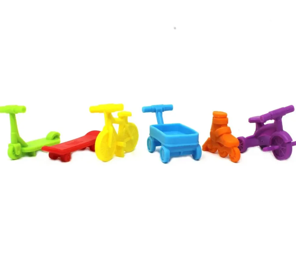 Cet ensemble comprend 6 compteurs différents : scooter, vélo, patin à roulettes, tricycle, planche à roulettes et chariot. Chacun est disponible en 6 couleurs différentes.