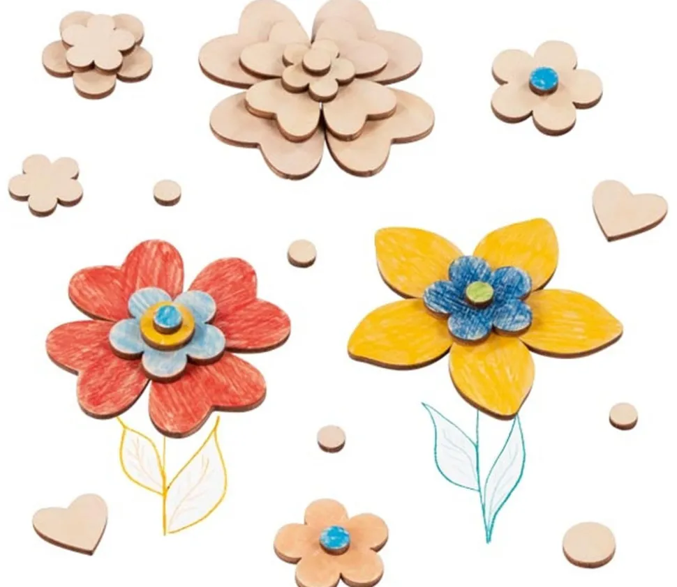 Kit créatif magie des fleurs : 75 formes en bois naturel plates composées de : 10 grands coeurs / pétales, 10 petits coeurs / pétales, 10 grandes feuilles, 10 petites feuilles, 10 grandes fleurs, 10 petites fleurs, 5 grands ronds et 10 petits ronds.
