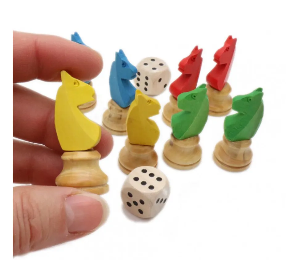 8 pions de chevaux en relief en buis de 4.3 cm de haut et 1.9 cm de diamètre + 2 dés en bois naturel de 16 mm. Pions en bois en 4 couleurs pour le jeu des petits chevaux (2 dadas rouges, 2 dadas verts, 2 dadas jaunes, 2 dadas bleus). Super pions de jeu de remplacement pour vos jeux de société. Fabrication en France.