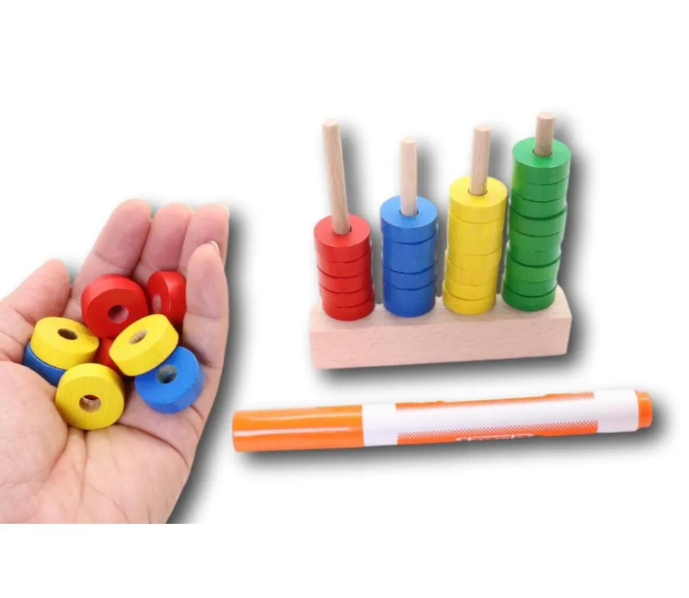 Stimulez l’apprentissage avec cet abaque de tri en bois résistant, comprenant un socle à 4 tiges et 40 jetons colorés (rouge, vert, jaune, bleu).