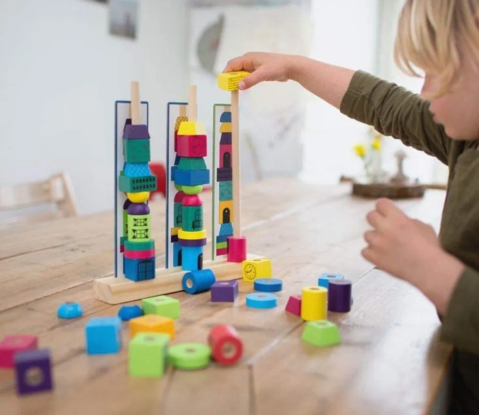 Abaque ville. Créez des tours colorées avec ce jeu éducatif. Le rêve de tout petit architecte et de créer les plus belles tours.