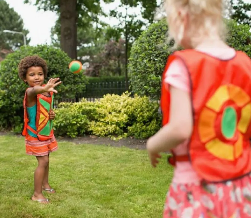 4 dossards enfants avec pièces en velcro scratch et 4 balles à lancer. Jeu de plein air idéal pour jouer à lancer dans le jardin ou parc. Un set pour jouer pour deux à quatre joueurs. C’est amusant d’attraper les balles avec son ventre ou son dos et d’éviter que l’autre joueur réussisse à nous atteindre. Jouet sportif fun pour faire se dépenser les enfants. Set pour joueurs de 4 ans et plus. Attention ! Il faut bien viser !