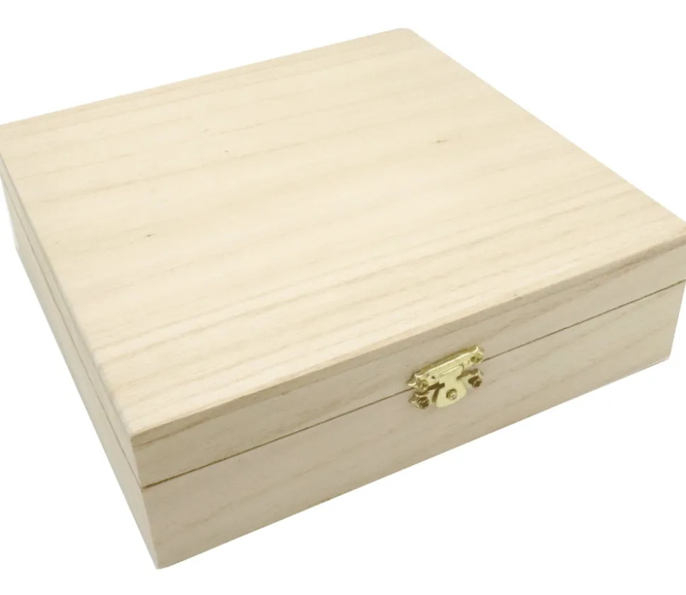1 Coffret bois naturel 4 compartiments avec fermoir et charnières. Dimensions extérieures 195 x 195 x 55 mm