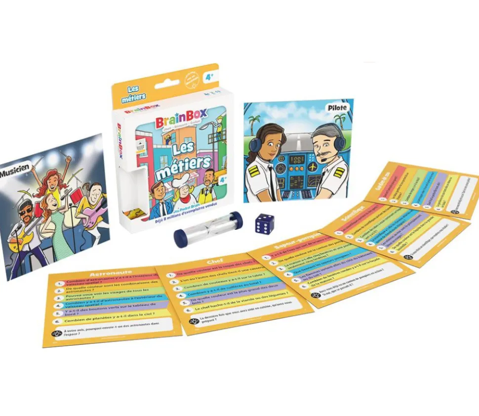 BrainBox pocket les métiers. Jeu d’observation et de mémoire. Jeu familial rapide pour apprendre et découvrir avec les enfants différents métiers. Une édition de poche facile à emmener partout, parfait pour les vacances. Version de 150 questions avec un sablier pour limiter le temps. Pratique, vous pouvez faire une partie avec vos amis ou en famille au restaurant en attendant les plats, dans les transports en commun (train, bus…)