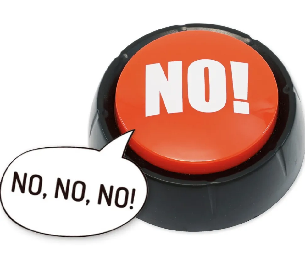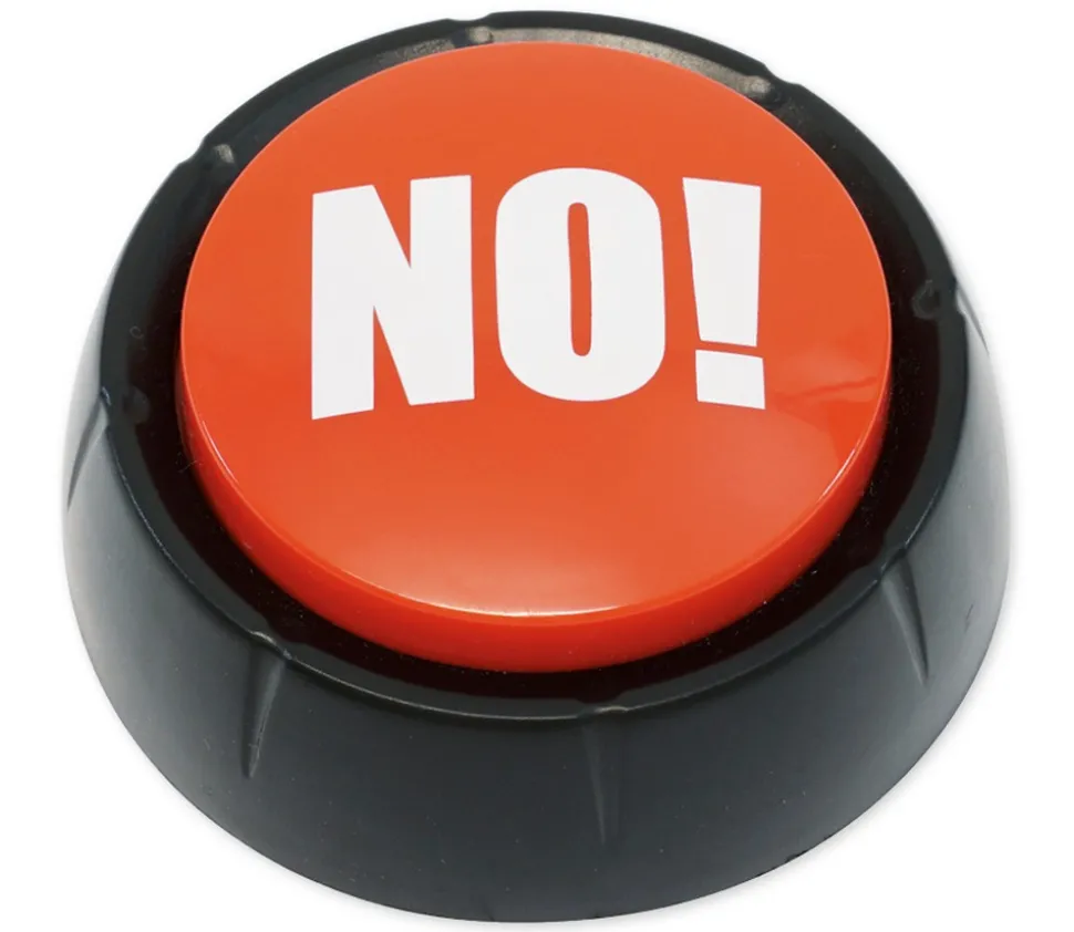 Sonnette de quiz électronique qui réagit de manière sonore lorsque que le joueur appuie dessus : on entend le mot « No ». Différentes voix et intonations sont utilisées pour varier le son du buzzer.