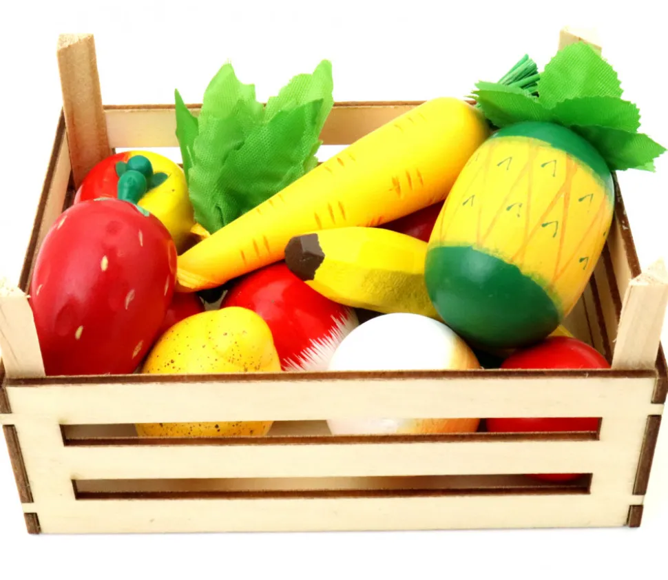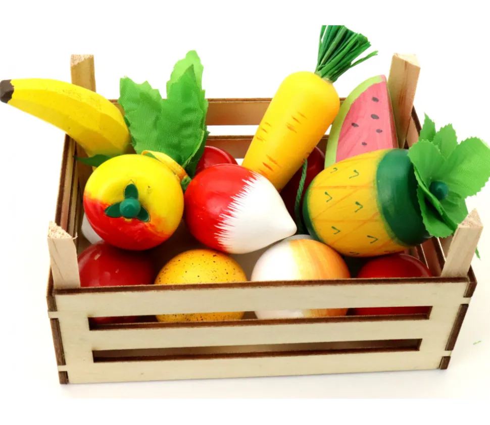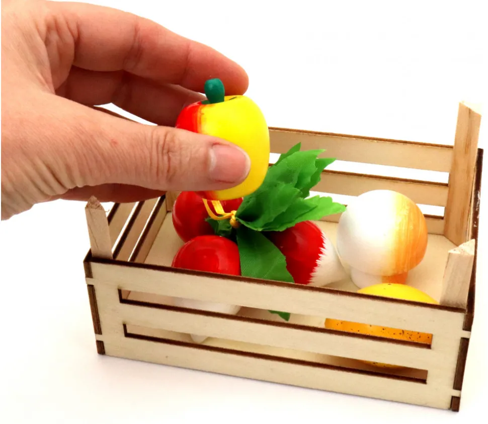 Accessoire de jeu, cette mini cagette en bois naturelle vous permet de ranger différents accessoires de jeux. Idéal comme mini cagette de fruits ou légumes pour jouer à la marchande.
