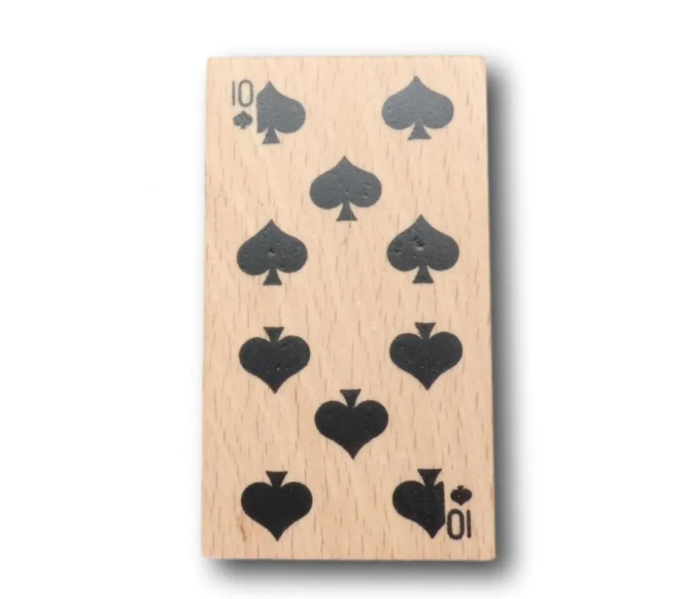 Carte à jouer en bois avec dos noir de 7 x 3.8 x 0.5 cm. Grande carte en bois avec une illustration de carte à jouer type cartes standards pour belote, rami, bridge.
