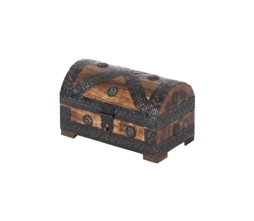 Coffre au trésor imitation « pirate ». Coffret en bois avec couvercle à charnière et décoration métal.