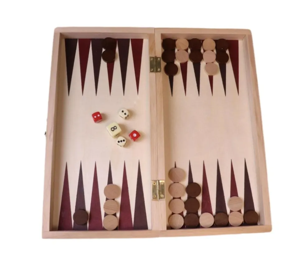 Tous les accessoires sont compris : 32 pièces en bois naturel et marron pour les échecs ( roi de 6 cm), 30 pions en bois de backgammon / jacquet (diamètre 1.9 cm), 4 dés à jouer 12 mm de 1 à 6 et 1 dé doubleur 15 mm.