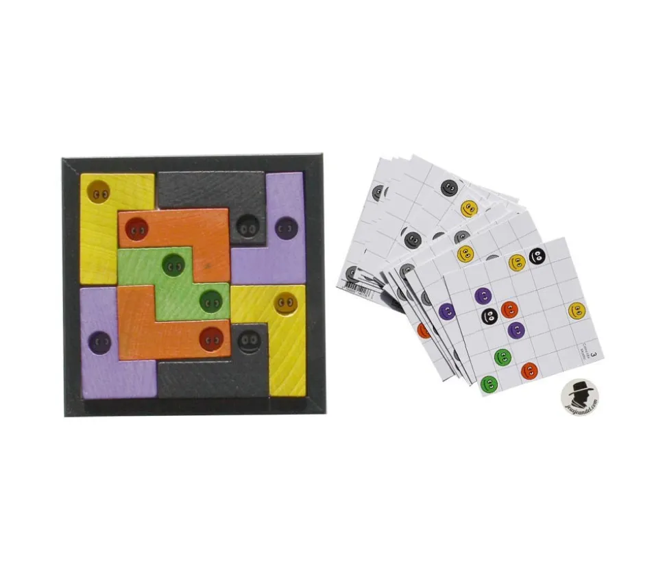 Jeu de logique Coincidix master. Jeu d’esprit où vous devrez positionner les pièces de manière à laisser apparaître les têtes colorées. 39 défis progressifs à réaliser. Dimensions cadre de jeu : 15 x15 x 2 cm.