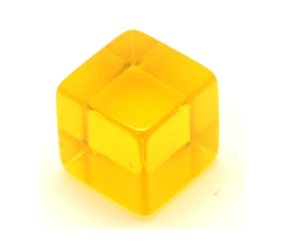 Cube couleur jaune translucide de 12 mm avec les angles vifs à utiliser comme jetons, pions de jeux, compteur. Cubes neutres en plastique transparent jaune. Accessoire de jeux de société pour joueur. Côté de ce cube 1.2 cm.