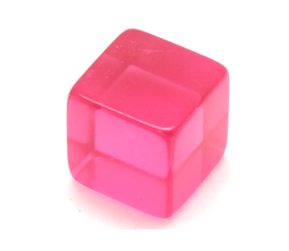 Cube couleur rose translucide de 12 mm avec les angles vifs à utiliser comme jetons, pions de jeux, compteur. Cubes neutres en plastique transparent rose. Accessoire de jeux de société pour joueur. Côté de ce cube 1.2 cm.