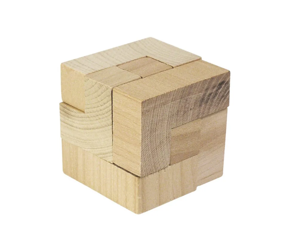 Cube en bois de 4.2 cm de côté composé de 7 pièces en bois brut. Jeu puzzle casse tête. Assemblage dans l’espace, perception 3D.