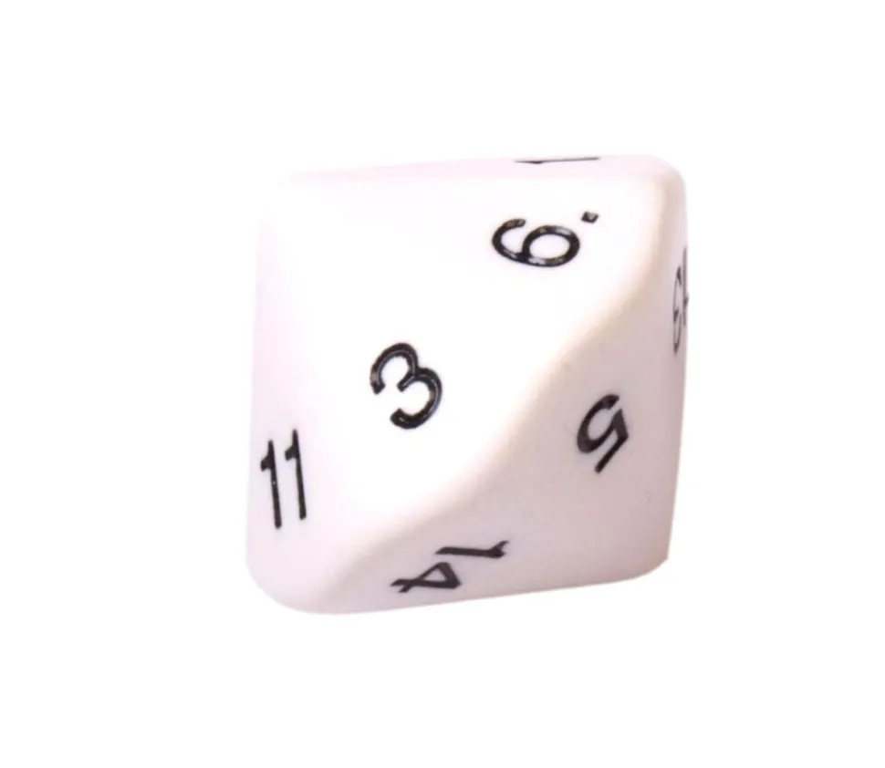 D14. Dé à jouer blanc avec 14 faces. Marquage des chiffres gravés en noir.